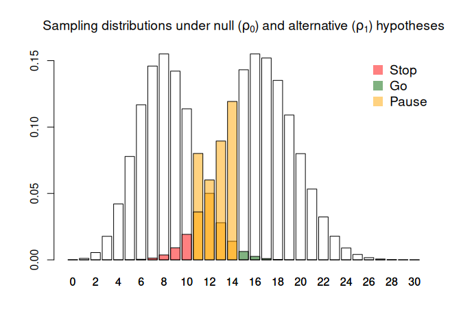 The idea is that we want these probabilities to be small, because ideally we want a “stop” outcome (where our statistic is less than the lower threshold $x_0$) under the null and a “go” outcome (where our statistic is greater than the upper threshold $x_1$) under the alternative. To find optimal thresholds $x_0$ and $x_1$, and an optimal sample size for the trial, we can set some constraints on each of these operating characteristics and find the smallest trial design which satisfies those constraints.